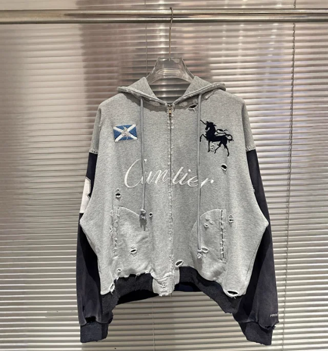 Heavy-duty color-blocked distressed vintage combat horse zipper hoodie