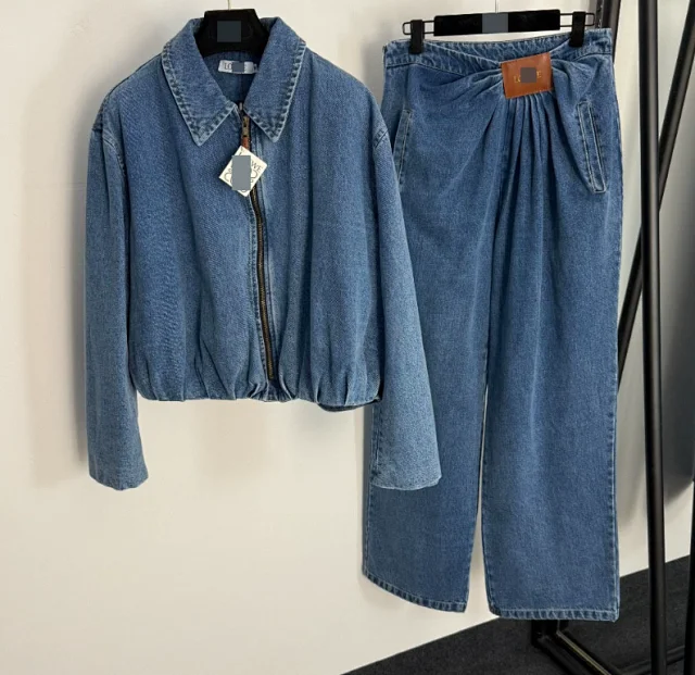 Fitted long-sleeve zip-up denim jacket with high-waisted denim pants set