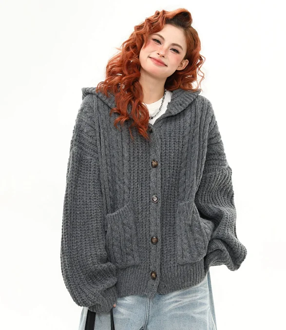 Twist-Knit Hoodie Cardigan Loose Lazy-Style Sweater